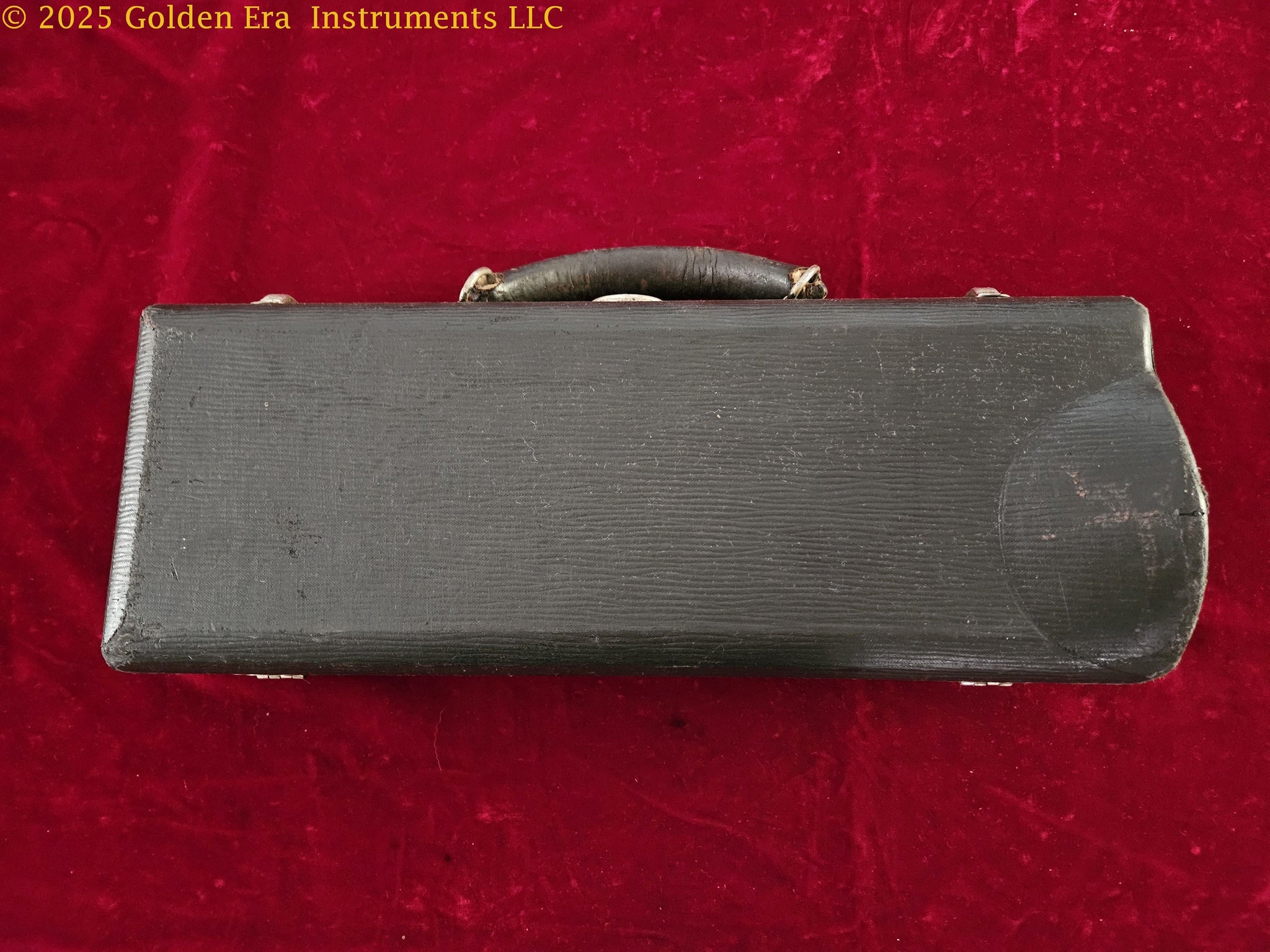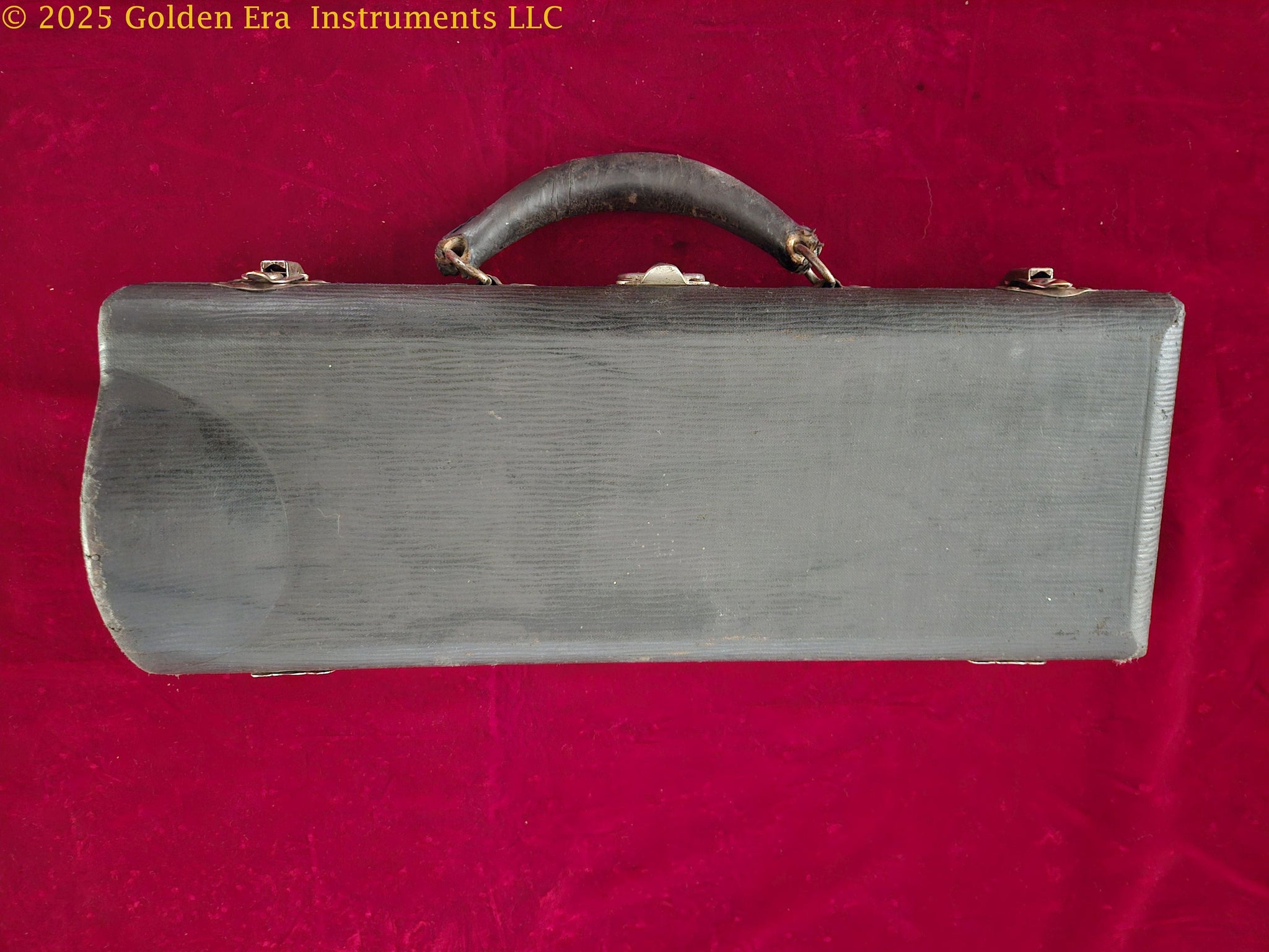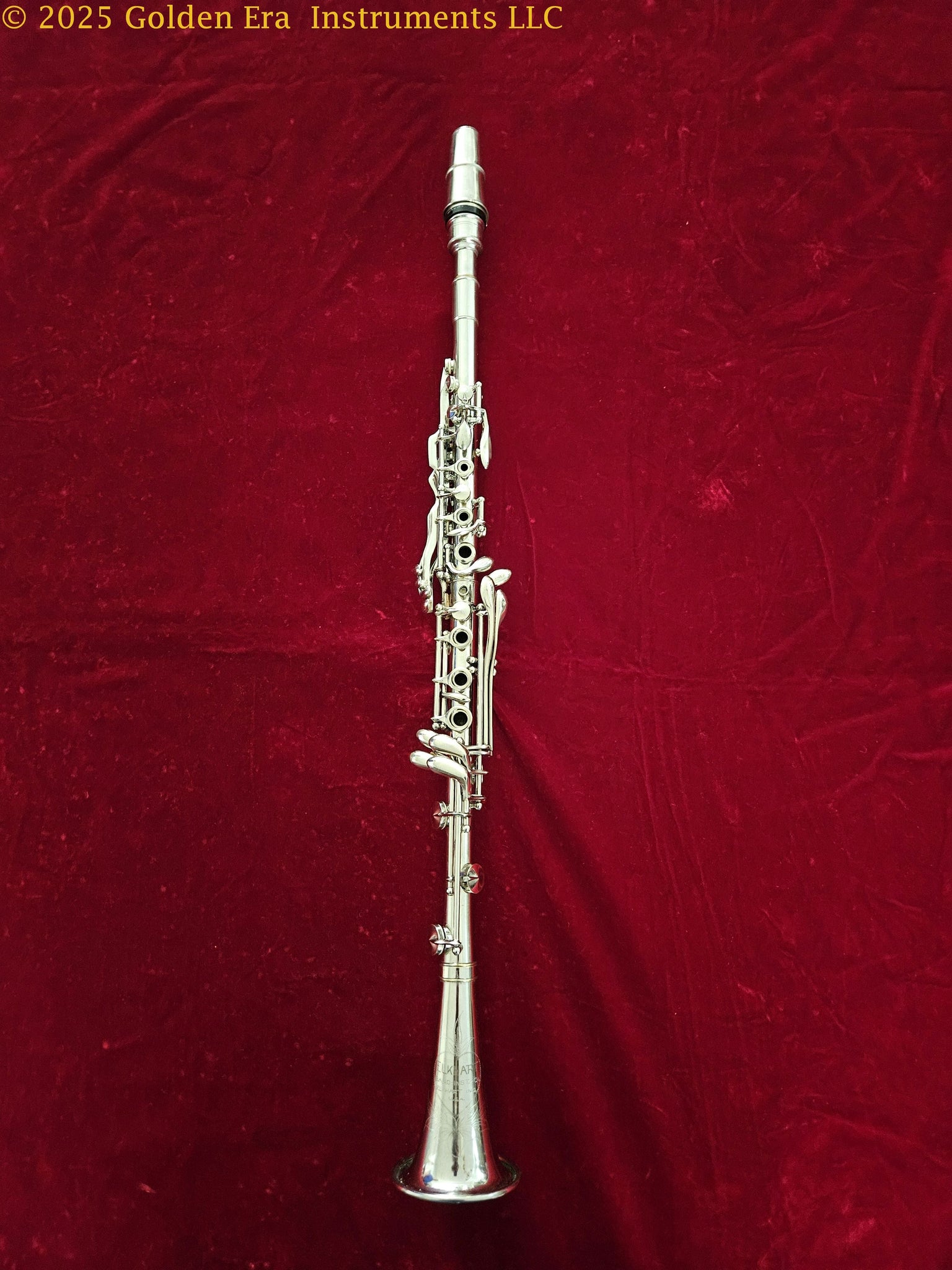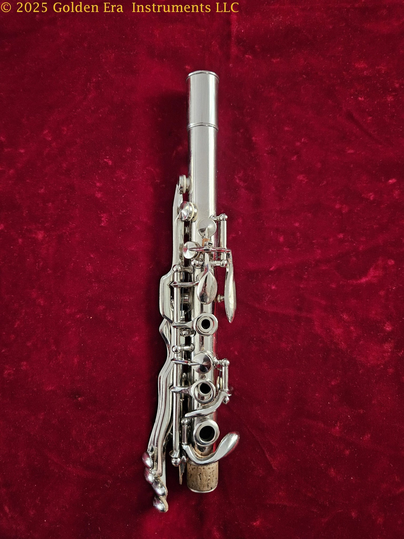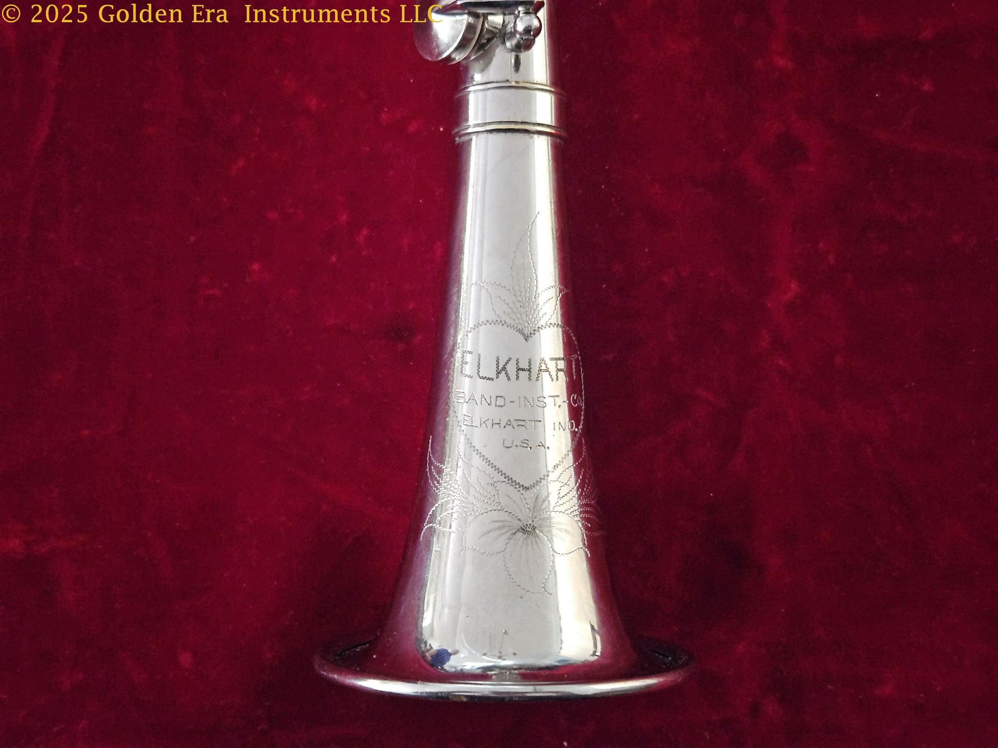 The Elkhart Band Instrument Co. was an interesting company that operated from 1923 until 1927. It was owned by the presidents of both Conn and Buescher. After Mr. Beardsley’s death, the Elkhart name became an intermediate line for Buescher. We rarely encounter a three-piece Elkhart clarinet, but we restored this one #17750. While no accurate serial number list exists for Elkhart Band Instrument Company, we estimate that this instrument was made around 1925 or 1925! It is a true, playable antique clarinet. It is in a matte silver plate with bright silver-plated keys. No major dents, mechanism is tight. New pads, corks, and needle springs. It comes in its original case with a Clark Fobes Debut mouthpiece. Own a piece of playable history for $450 plus shipping. Please see the photographs.